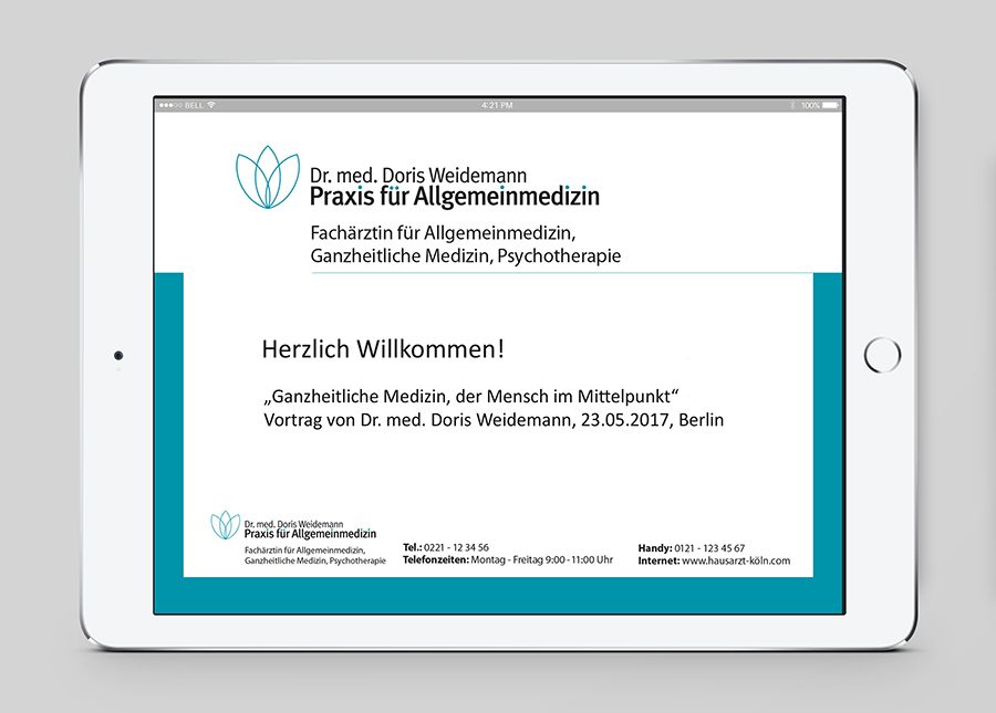 Konzeption und Umsetzung DIGITALER MEDIEN, die zusätzlich für die Arztpraxis relevant sind, unter Anwendung des neu erstellten Corporate Designs: Bildschirmhintergrund für das Smart-Phone, sowie Gestaltung entsprechender PowerPoint-Folien.