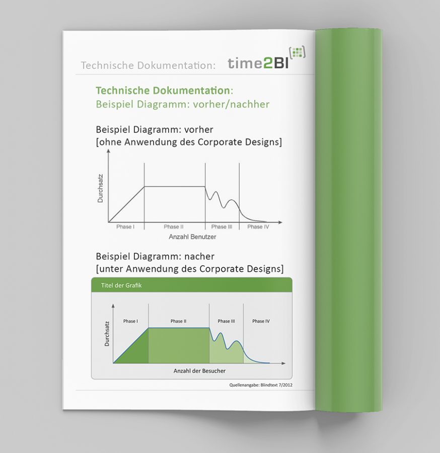 - Technische Dokumentation: Erstellung von designkonformen Word-Vorlagen (Templates), da dies einen Großteil der sichtbargemachten Leistungen des Unternehmens zur Analyse des Kundeninteresses darstellt. Eine Art Handbuch ist entstanden, das die unterschiedlichen Anforderungen visuell erfüllt: differenzierte Schriftarten, neue Formensprache, neu erstellte Icons etc.
