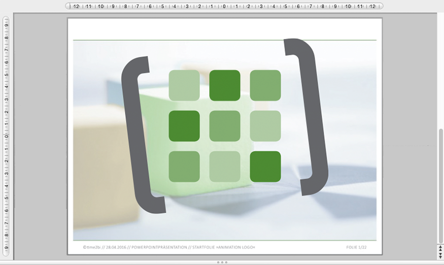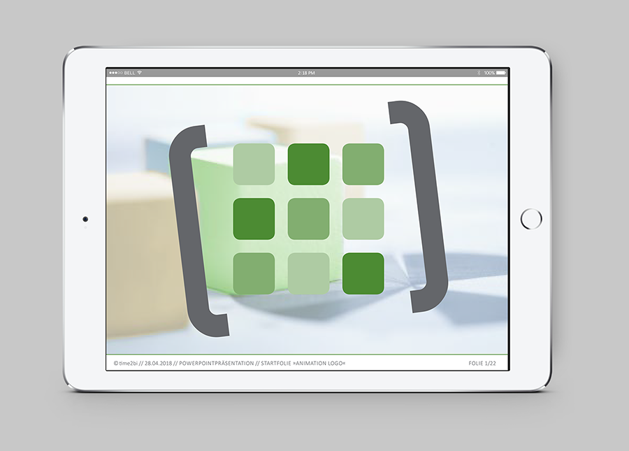 - Power-Point Folien: Erstellung von Master-Dokumenten für die eigenständige Befüllung durch die Mitarbeiter/innen des Consulting-Unternehmens. Auf der Startseite der Präsentation ist die Bildmarke des Unternehmens animiert, indem die einzelnen grünen Flächen ihre Farbigkeit verändern. Diagramme und andere Formen der Datenvisualisierung wurden entsprechend des neu erstellten Corporate Designs gestaltet.